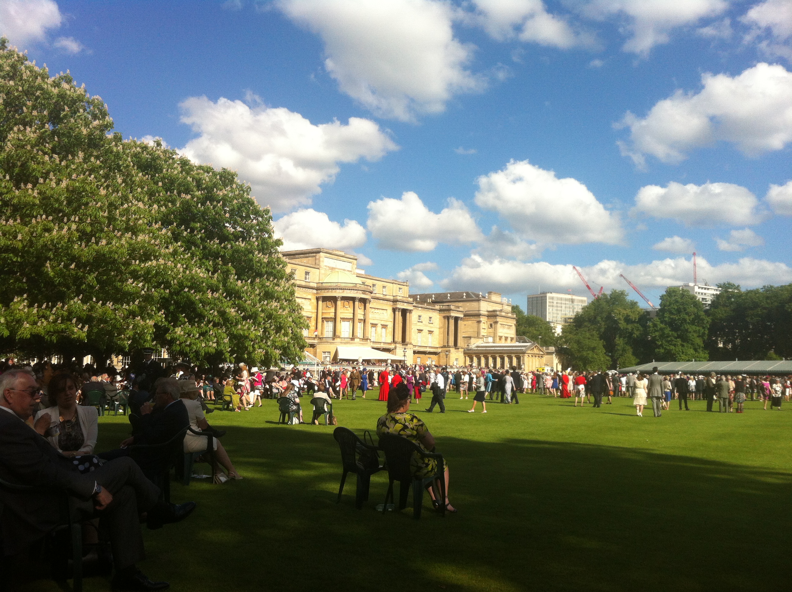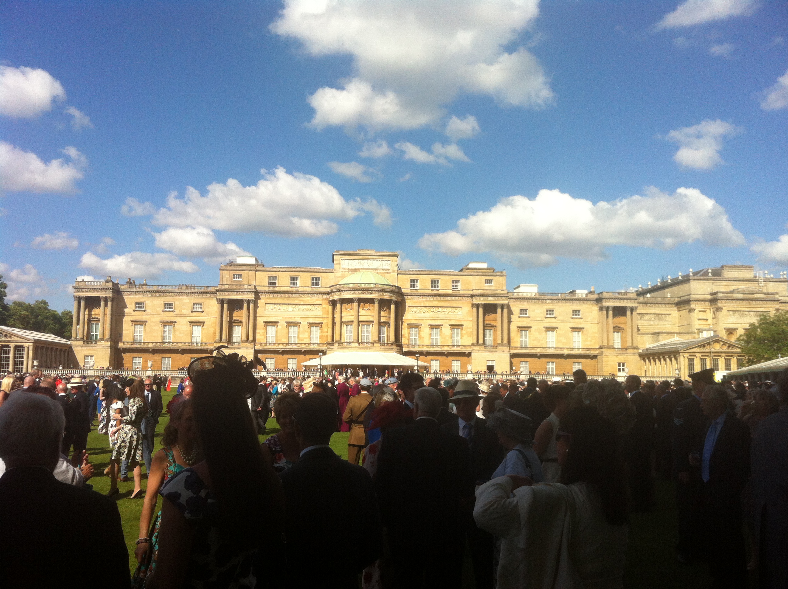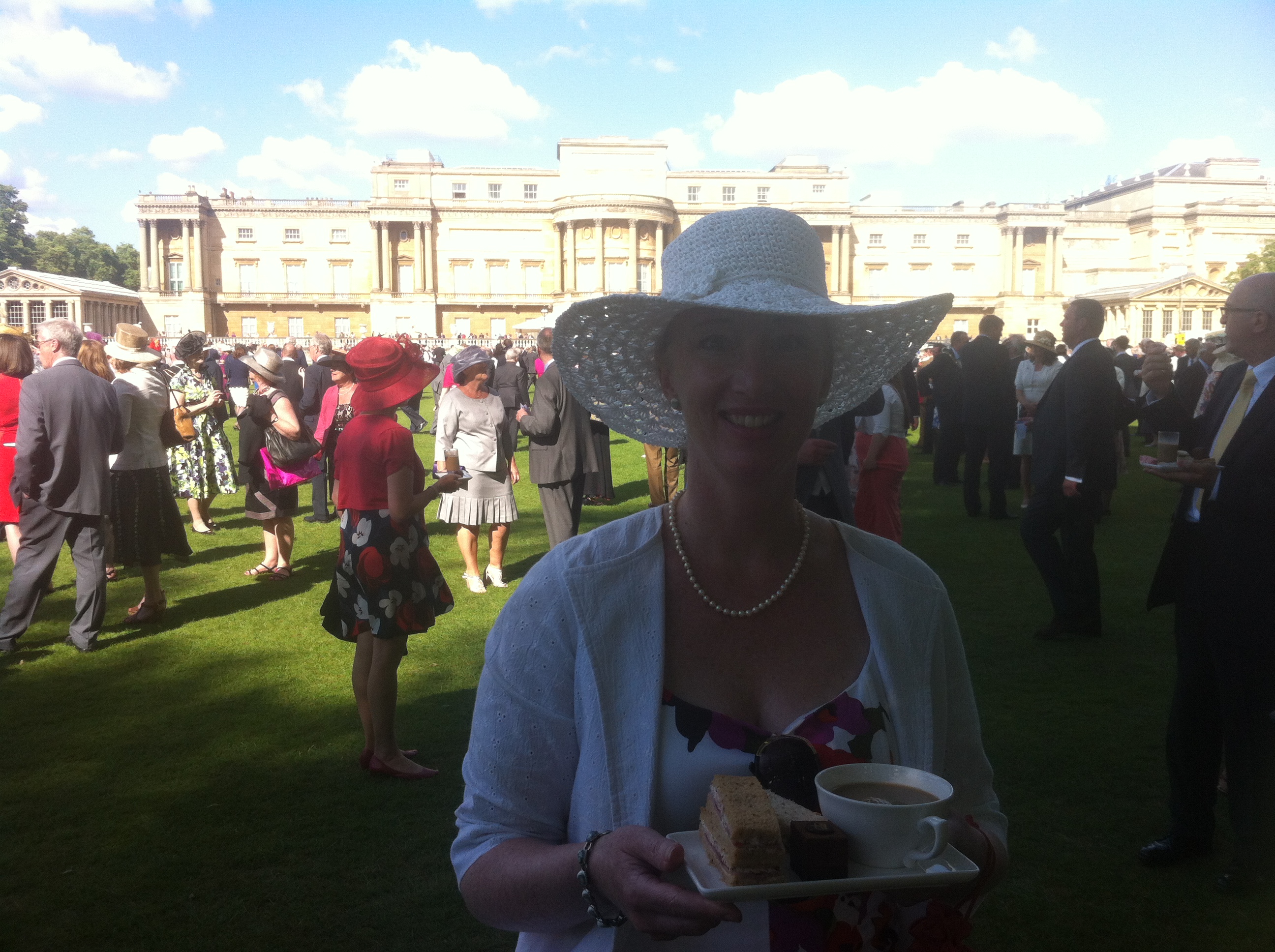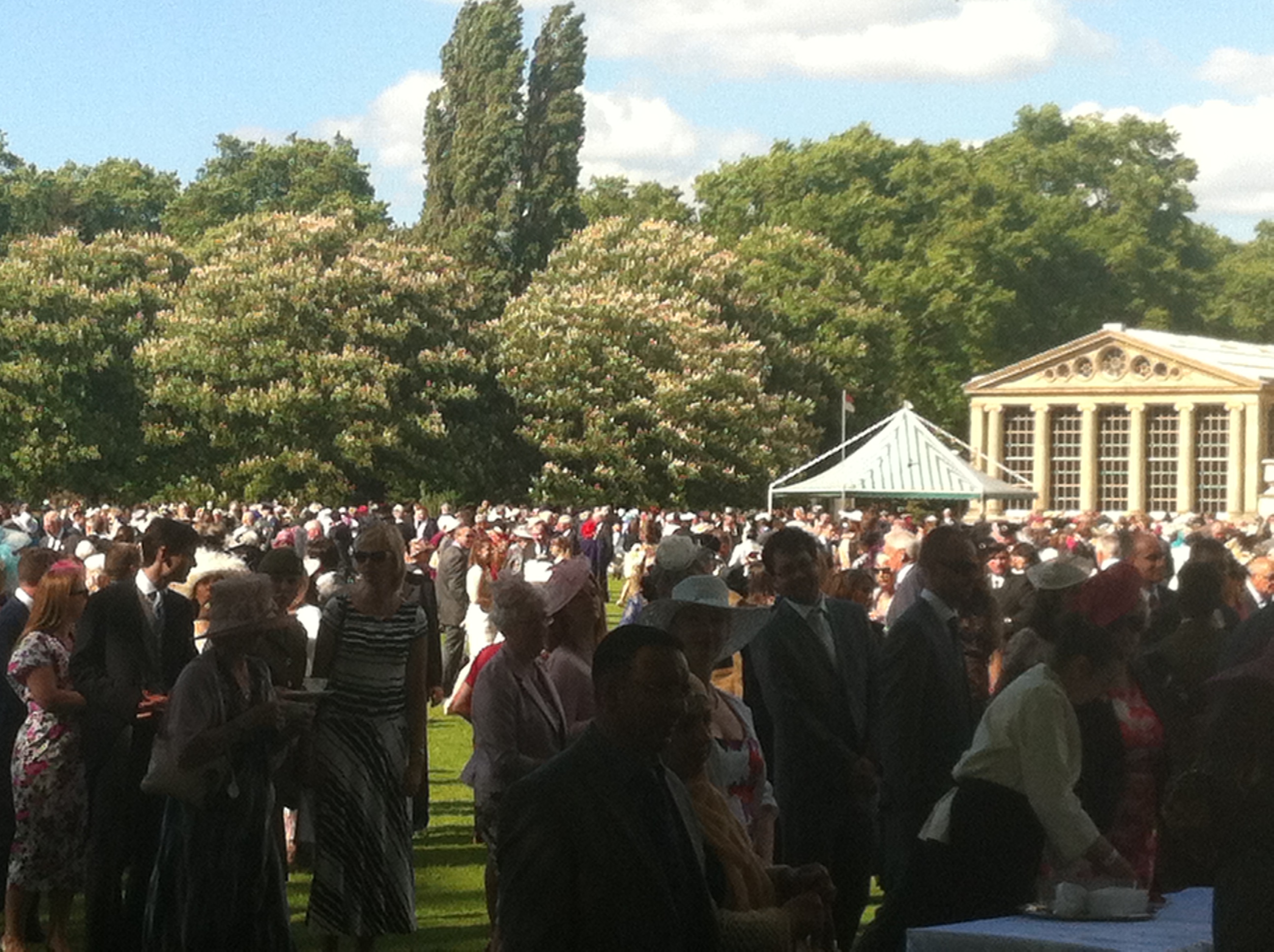 Lots of marquees, cucumber and mint sandwiches, cakes, ice cream and lemonade. No speeches just the Queen wandering past talking to selected people. Lovely gardens and trees.