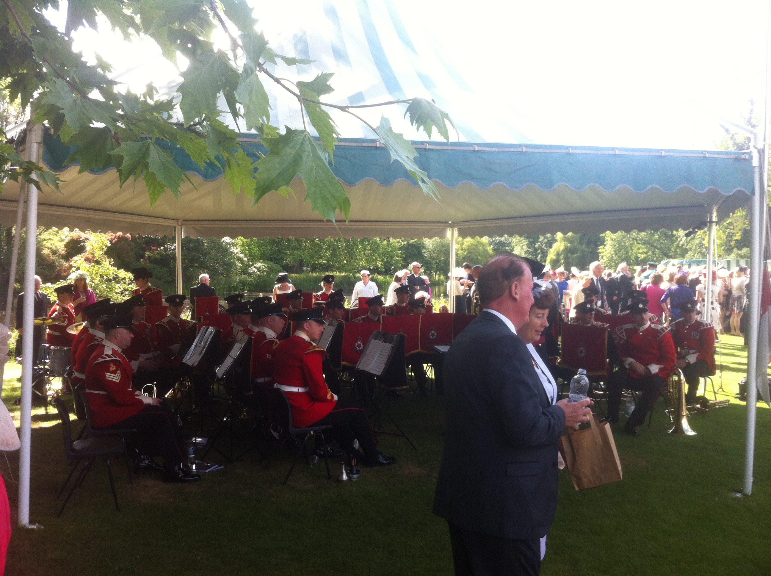 The party kicked off at 3pm and finished at 6pm. A couple of military bands played some music and you can walk around the garden and lake. The Queen and other royals greet prearranged people as they walk to their tent for tea. I must say the food was brilliant and they even give you ice cream. The gardens were a bit of a let down as it was the last garden party of the season nothing was really in flower or looked that nice aside from the lake.