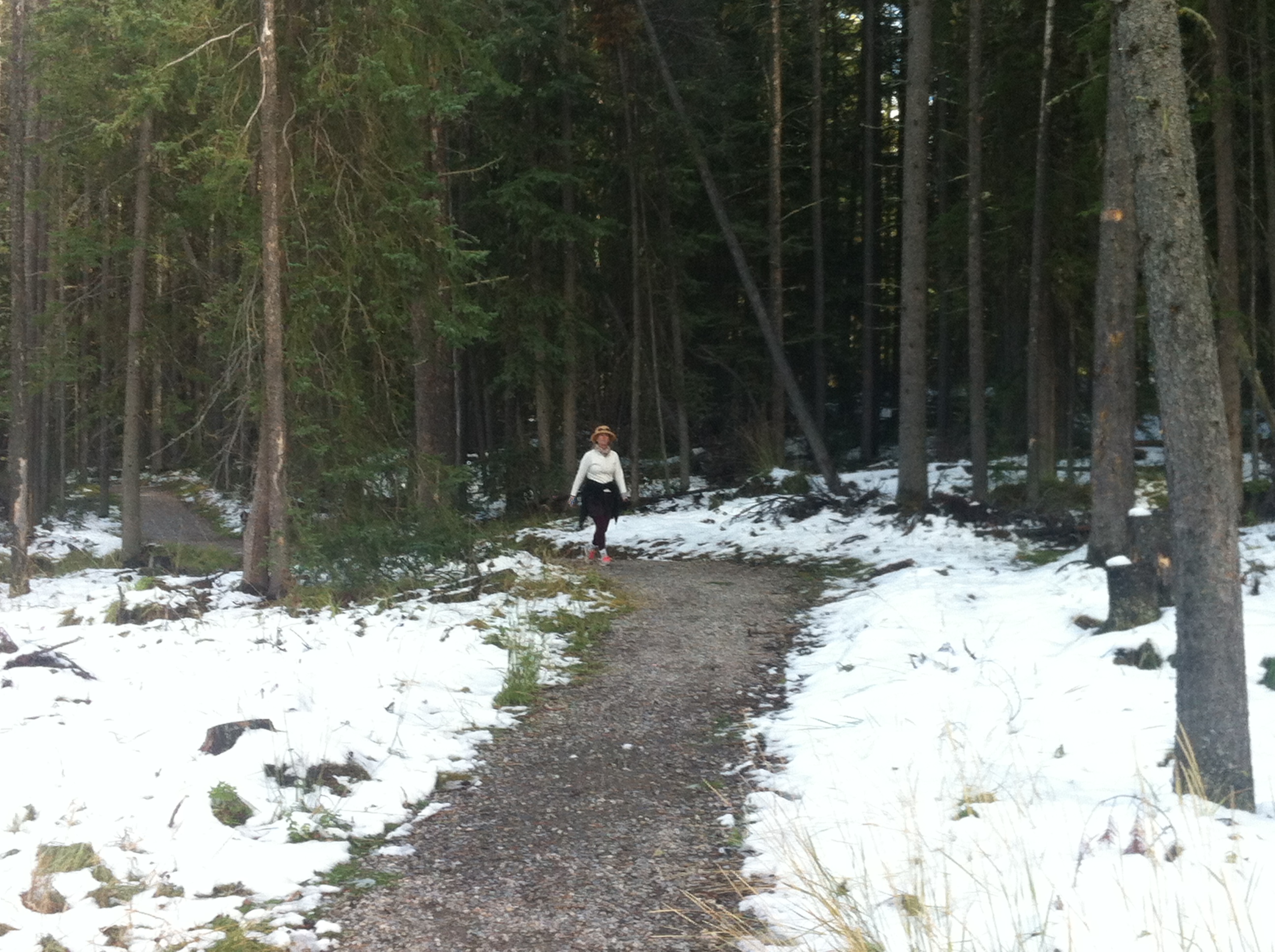 The next day we decided to go to Miette Hot Springs stopping on the way to do a two-hour hike at Maligne Canyon. The walk is lovely but very busy with tour buses stopping every few minutes it seemed. However, we did the upper walk and came back along the canyon. Most people did not do this and just walked to the first or second bridge for a photo-op and then got back on their bus or RV. After the walk we drove on to Miette to soak in the hot pools which were very enjoyable. A decision was also made to get a cabin for the night which turned out a fortunate stroke of luck as the next morning we woke up to a winter wonderland. Staying at the Miette Hot Springs Resort was a well spent $106 and the restaurant had delicious food.